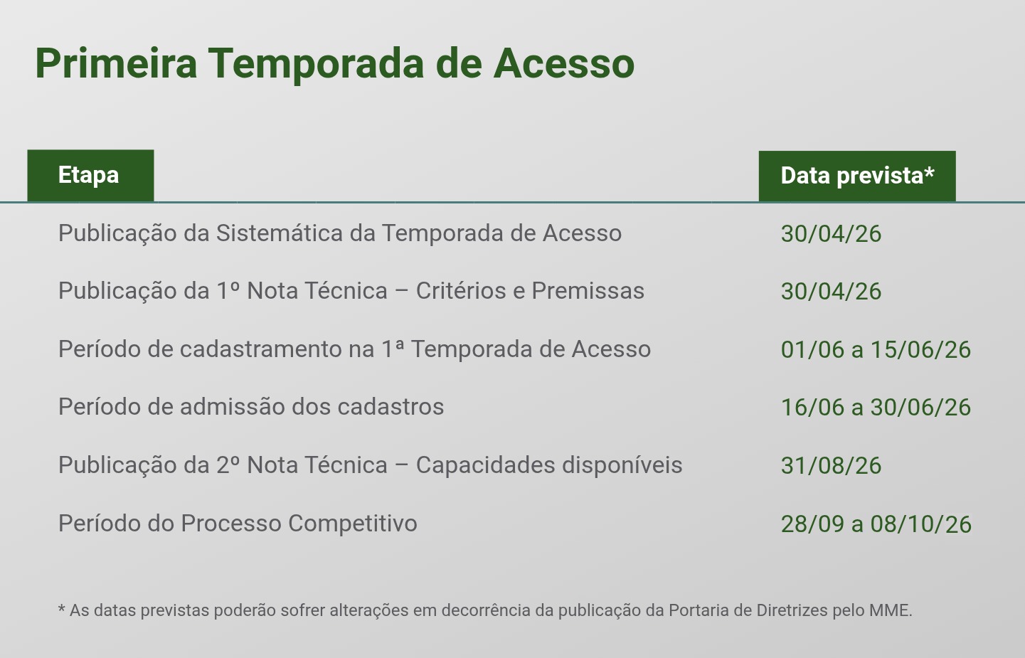 A partir da publicação do Decreto, o ONS terá 10 meses para realizar a 1ª Temporada de Acesso, tendo que divulgar com antecedência de 90 dias um cronograma com as etapas dessa temporada. Todos os Pareceres de Acesso relacionados às solicitações em andamento deverão ser emitidos antes do início dessa 1ª temporada. A partir de 2027 deverão ser realizadas 2 Temporadas de Acesso por ano.