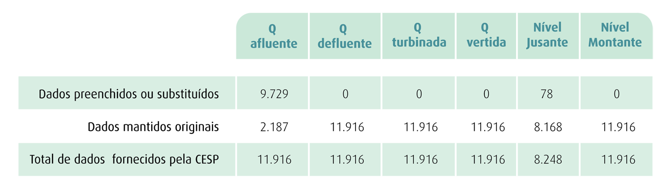 Um resumo da consistência das séries de dados operativos de Ilha Solteira é apresentado na Tabela 10.3 abaixo, ilustrando a quantidade de dados que foram preenchidos ou modificados no processo de consistência, a quantidade de dados que foram mantidos, os dados originais e o total de dados das séries fornecidas pela CESP.