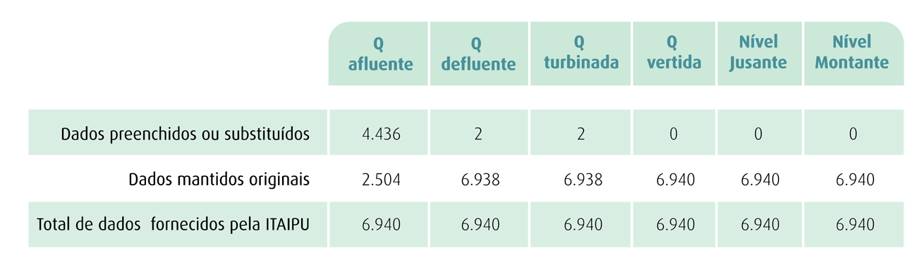 Os dados operativos de Itaipu também são de boa qualidade. Da mesma maneira que nas usinas da CESP, Itaipu forneceu dados consistentes de vazão afluente, defluente, turbinada e vertida, assim como para níveis de jusante e montante. As vazões afluentes corrigidas por balanço hídrico resultaram similares às informadas por Itaipu, confirmando a boa qualidade dos níveis de montante e das vazões defluentes.
