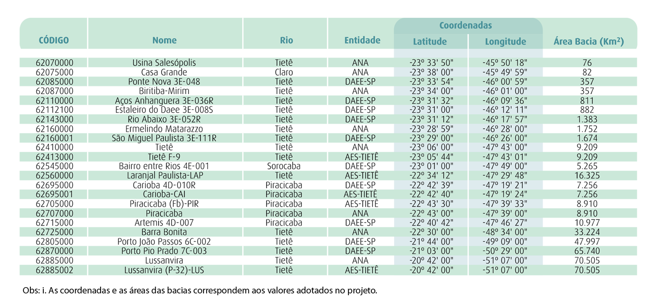 Para os postos fluviométricos do DAEE, de forma geral, foram adotadas as relações cota x descarga fornecidas, uma vez que estavam bem ajustadas às medições de descargas líquidas. No entanto, nas estações de Carioba 4D-010R (62695000), Artemis 4D-007 (62715000), Ponte Nova 3E-048 (62085000), Aços Anhanguera 3E-036R (62110000) e Porto João Passos (62805000), foi necessária a realização de novos ajustes para alguns períodos e/ou trechos das correspondentes curvas-chave.